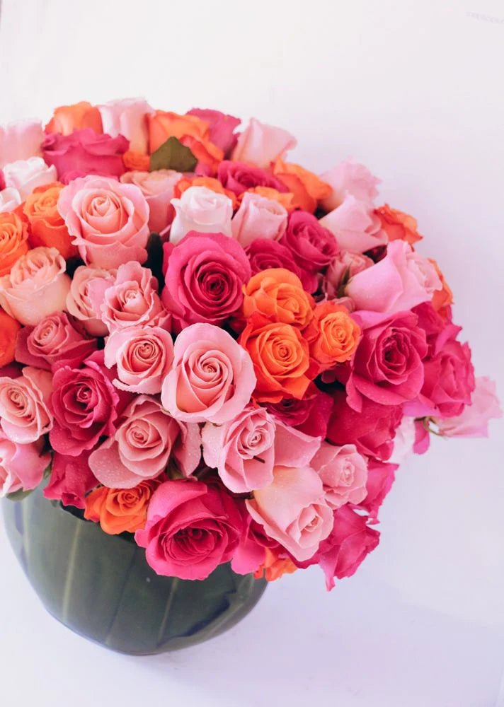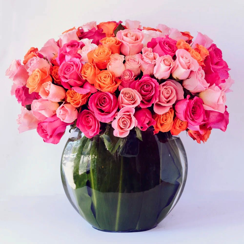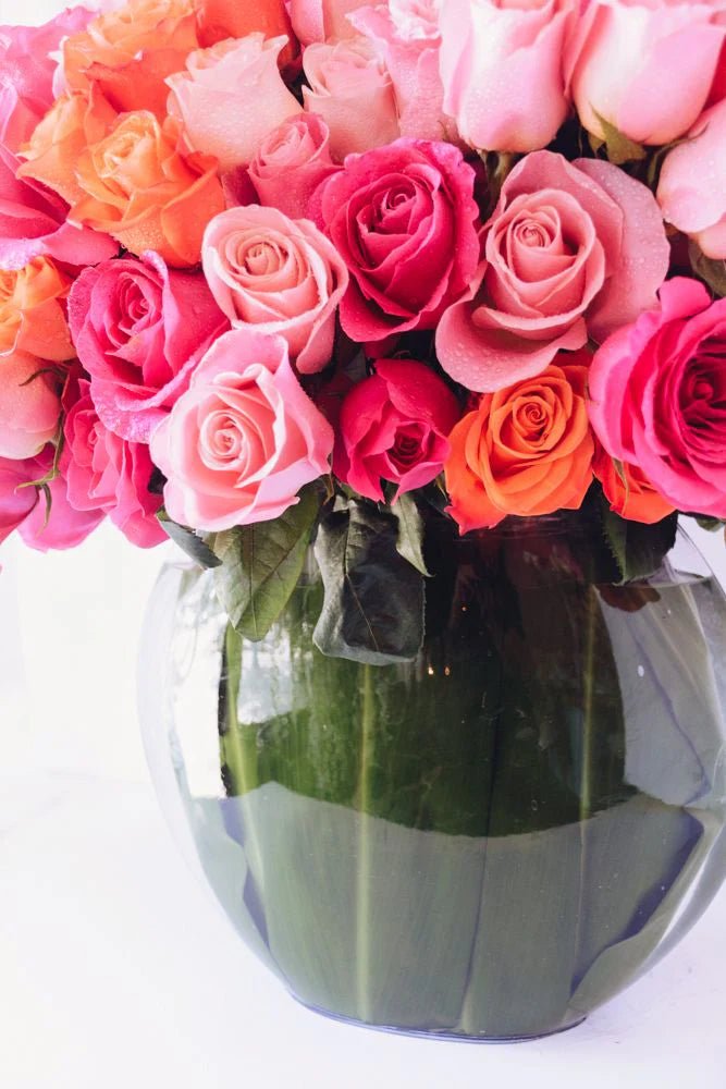 Bougie Baby is an extravagant composition of up to 100 lush Roses in shades of hot pink, blush, tangerine, and cream. The interior of the 13 inch tall glass fisheye vase is lined with Ti leaf for a polished touch.