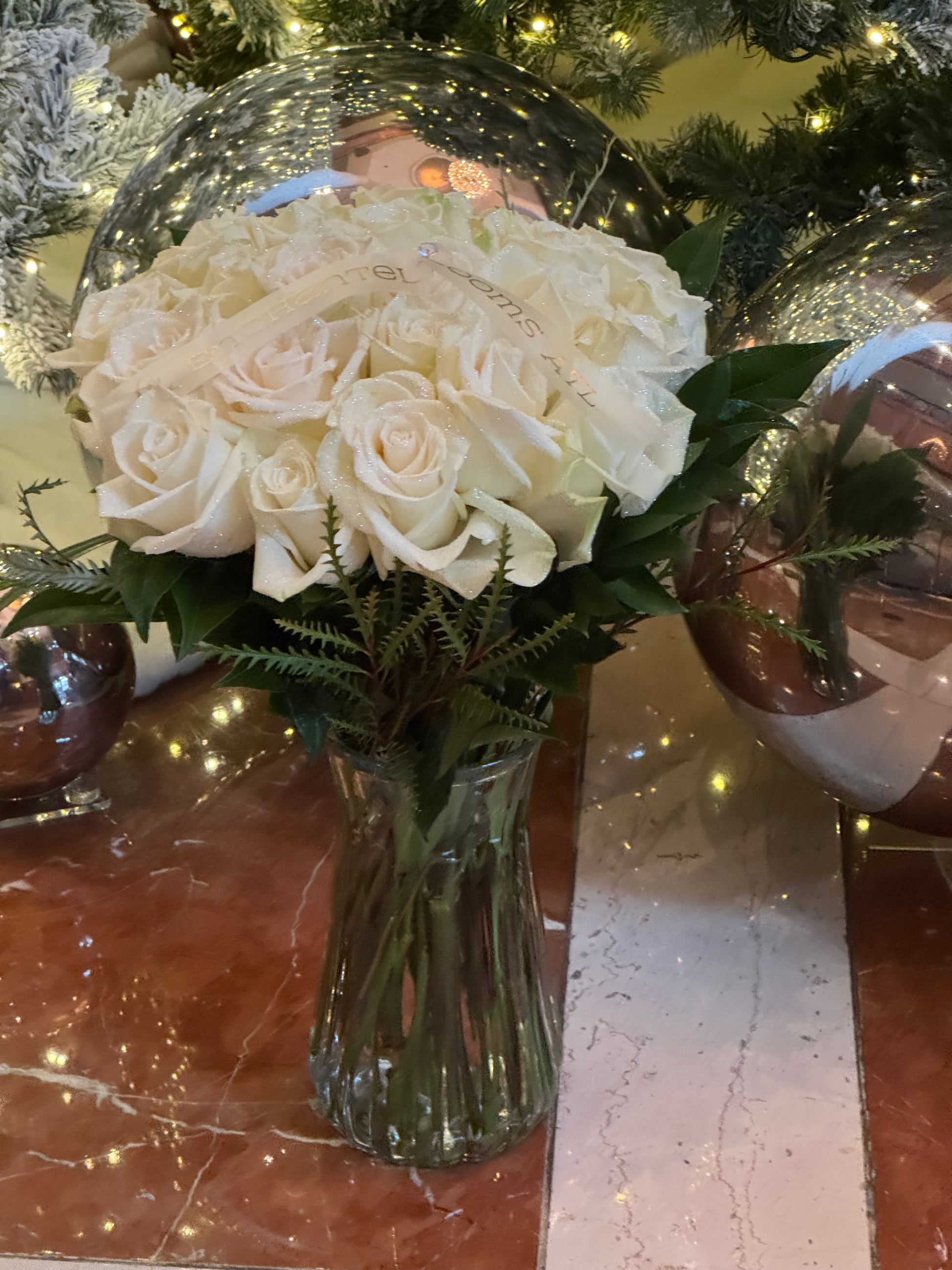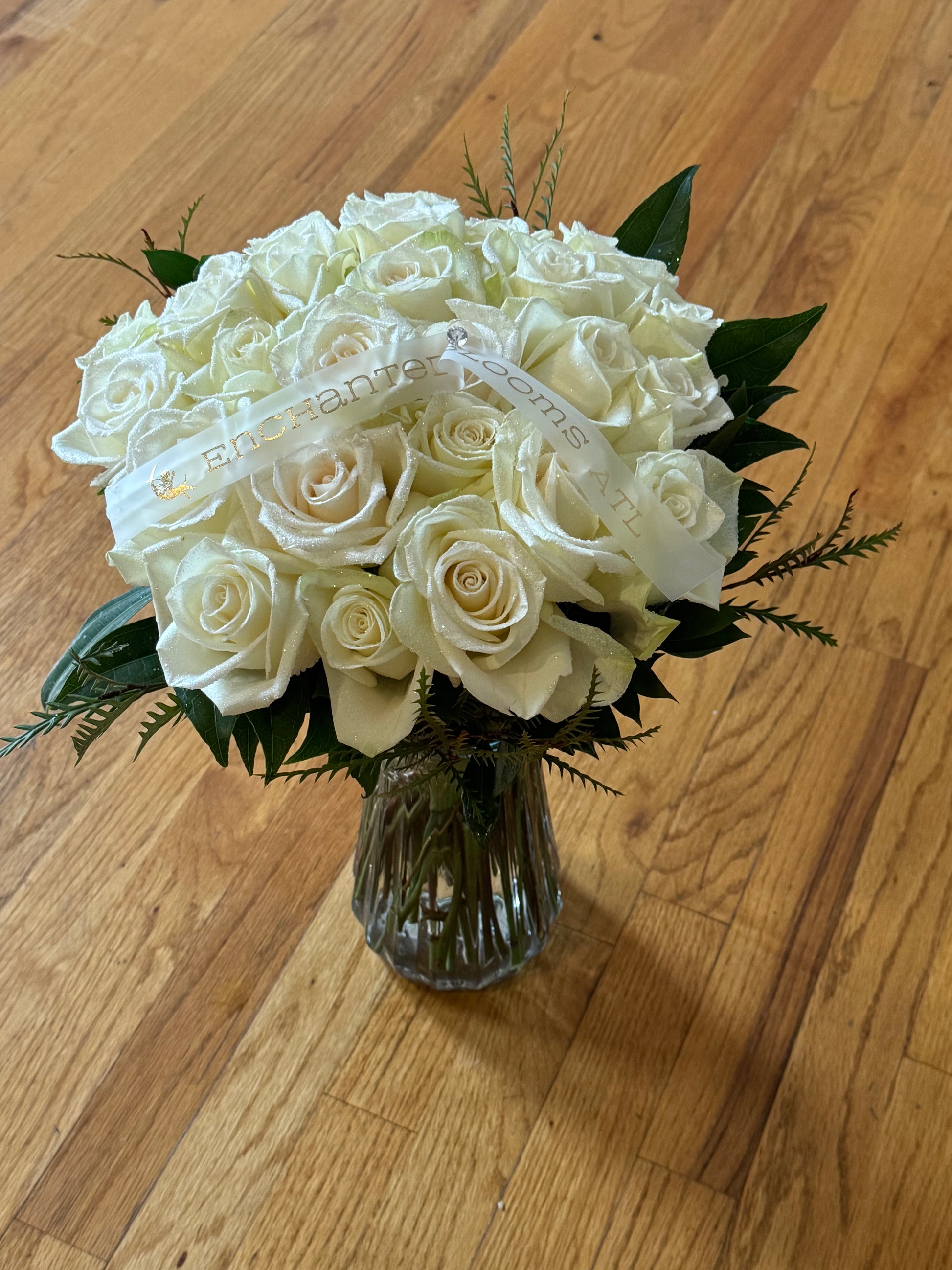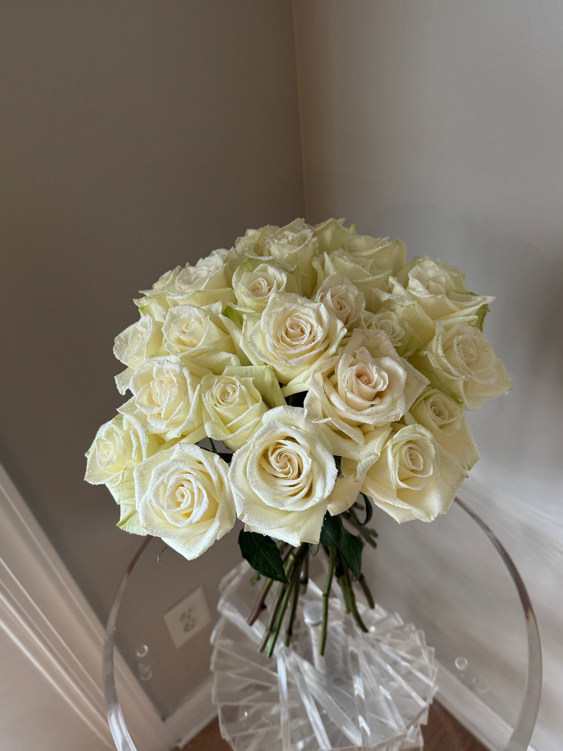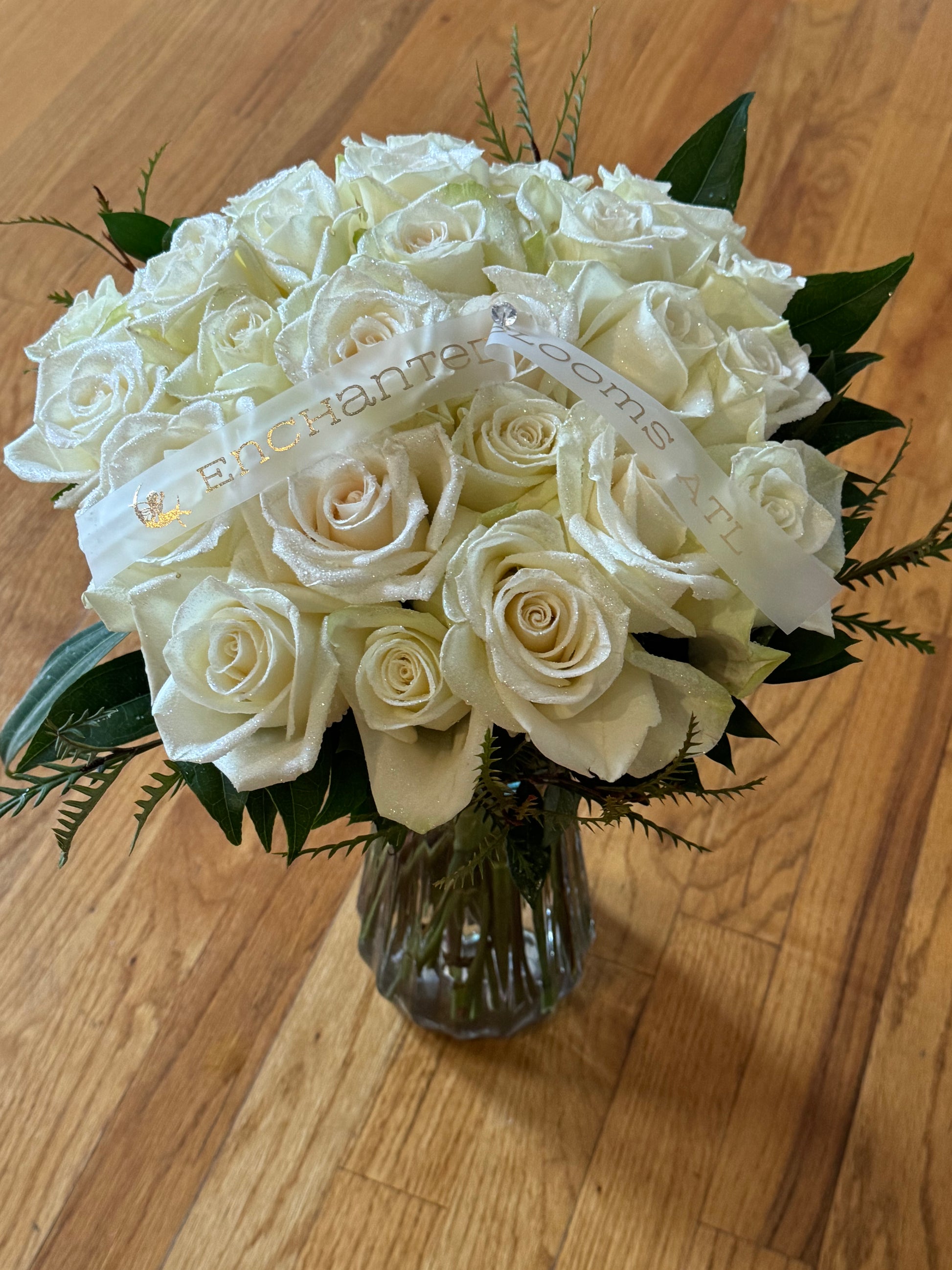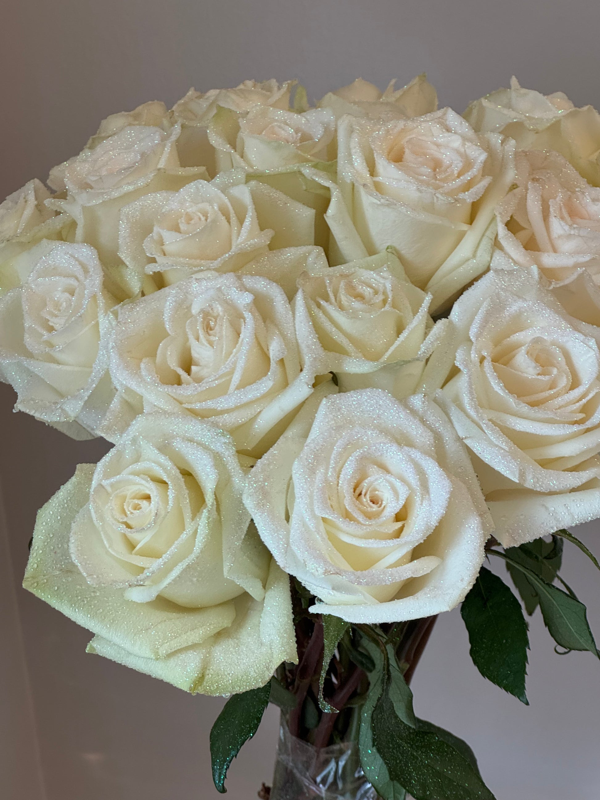 Enjoy the modern twist beauty of live fresh cut roses with a sparkling glitter Long Stem white Glitter Rose Bouquet. This arrangement features real Roses with glitter elevates gift of roses multiple levels.