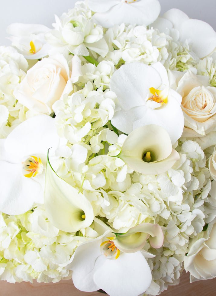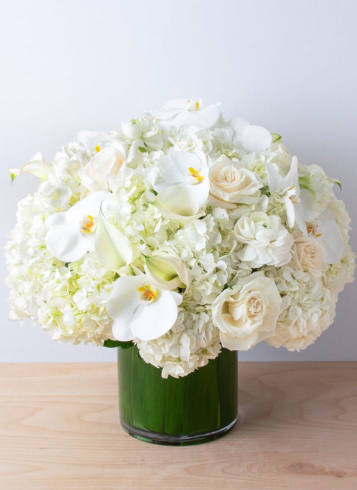 A luxurious and elegant showstopper arrangement. A lush design of premium, all-white florals including hydrangea, roses, phalaenopsis orchids, and ranunculus, arranged in a leaf-lined clear glass vase.