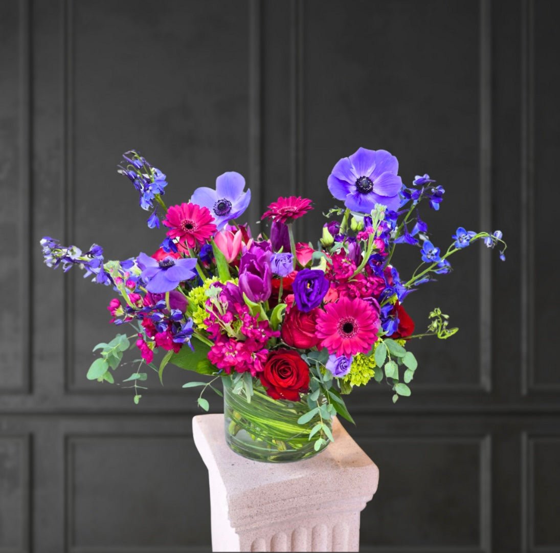 One of our top-selling bouquets! This floral arrangement features seasonal flowers in berry tones, presented in a low vase. It’s ideal for displaying on a coffee table or desk. The compact design offers a classic and timeless look.