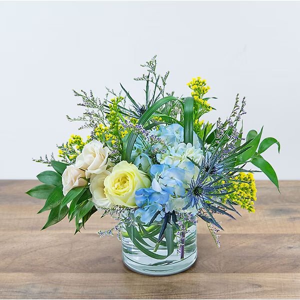 The gentle blues and whites in this arrangement bring a sense of calm to any space. This serene bouquet features blue hydrangea, white roses, blue eryngium, lily grass, solidago, limonium, and Italian ruscus, all displayed in a clear glass vase. Wilde Blue is an ideal gift for welcoming a new baby, wishing someone well, or simply to brighten someone's day.